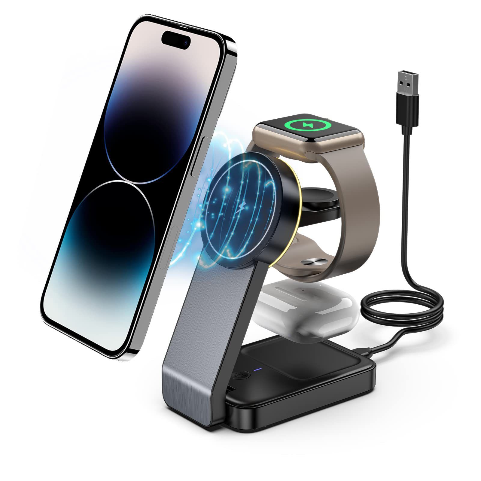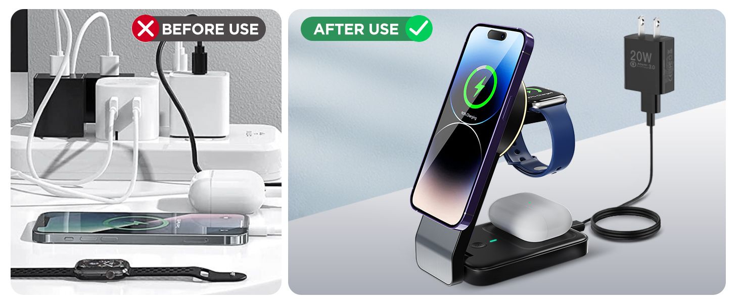 - 【3-in-1 Charging】Simultaneous charging for iPhone 15/14/13/12, Apple Watch, and AirPods in a compact hub.